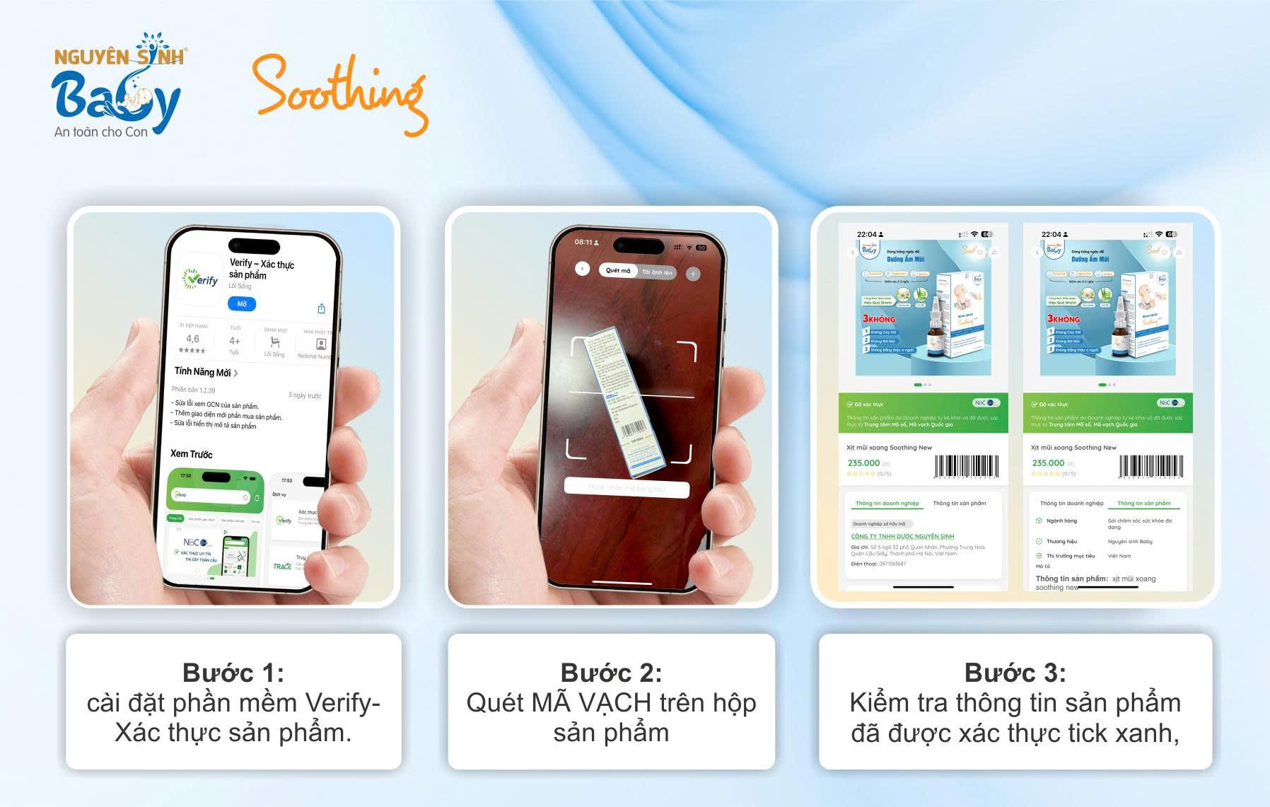 Tất cả sản phẩm Soothing chính hãng đều được in mã QR độc quyền trên tem chính hãng được dán trên vỏ hộp và thân chai, hũ. Khi quét bằng ứng dụng Zalo hoặc các app kiểm tra mã QR như iCheck, hệ thống sẽ trả về thông tin chi tiết gồm: