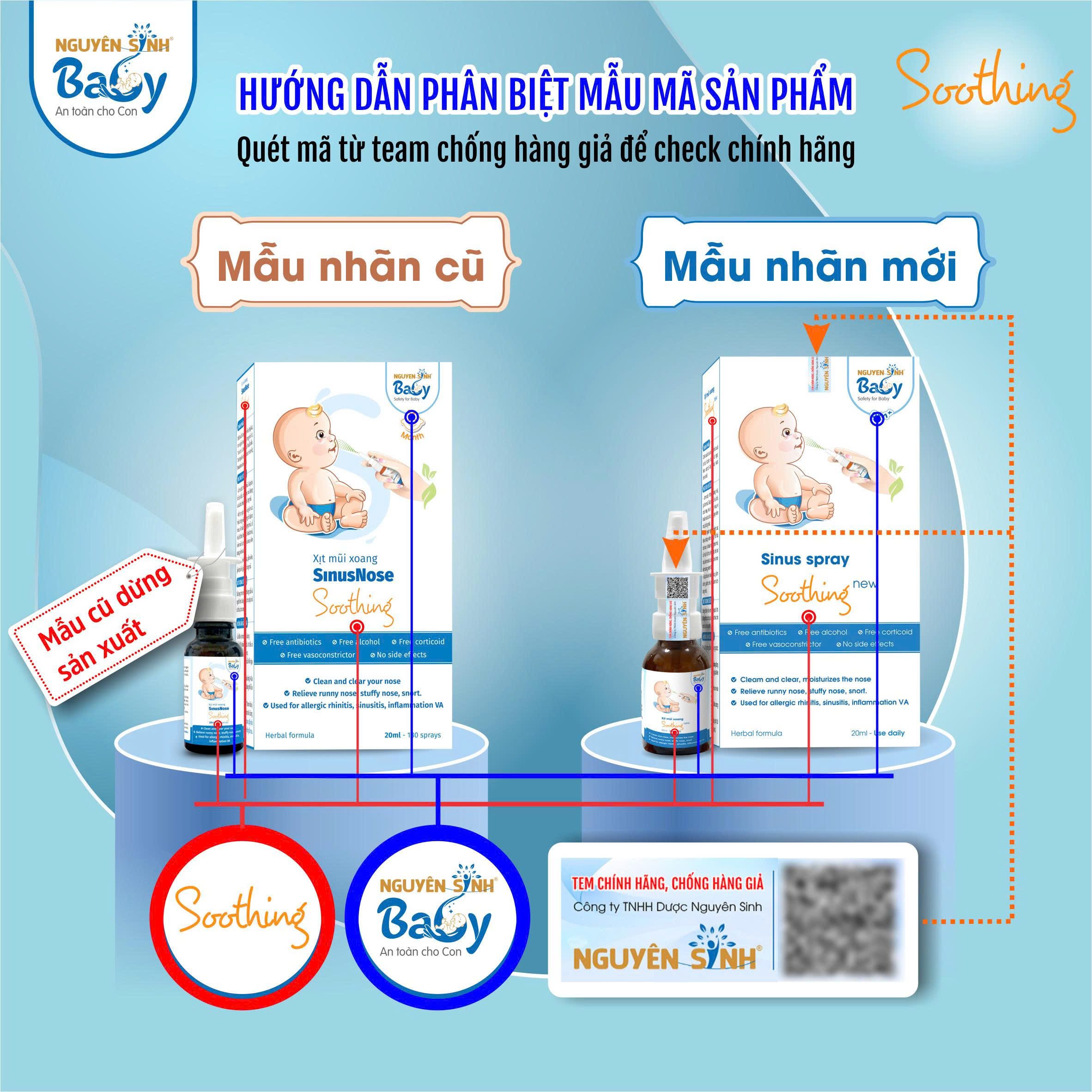 Soothing là dòng sản phẩm chăm sóc sức khỏe hô hấp và thân nhiệt cho trẻ sơ sinh và trẻ dưới 1 tuổi, được xây dựng dựa trên triết lý “thảo dược lành – chăm sóc tự nhiên”. Các sản phẩm của Soothing sử dụng công thức từ các thành phần thảo dược an toàn, không chứa kháng sinh, không corticoid, không chứa đường và đặc biệt được thiết kế chuyên biệt để phù hợp với cơ địa nhạy cảm của trẻ nhỏ ngay từ giai đoạn sơ sinh. Soothing là thương hiệu thuộc quyền sở hữu của Nguyên Sinh Baby – thương hiệu con của Công ty Dược Nguyên Sinh, công ty có hơn 14 năm kinh nghiệm trong ngành dược phẩm Việt Nam. Trong hơn 3 năm qua, Soothing đã có mặt tại hàng nghìn nhà thuốc, phòng khám, chuỗi siêu thị mẹ và bé trên toàn quốc và đã được hơn 10.000